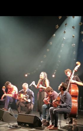 Et des chansons, il y en a eu. Et quelles chansons ! Elles ont été choisies par les cinq garçons, parmi toutes celles d’Amélie. En majorité des chansons d’amour car sous leurs airs de durs, les garçons ont le cœur tendre. Ainsi, c’était l’occasion de découvrir certains morceaux en « live » (« Fuseau horaire ») et d’en redécouvrir d’autres parés de nouvelles orchestrations (« Marchons », « Mes très chers », « Elisabeth »). Ce fut un plaisir de les voir s’envoler sur le rythme endiablé du jazz manouche. Les Doigts de l’homme maîtrisent leurs instruments à la perfection et leur complicité est clairement palpable.